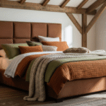 “A modern, low-profile bed with a linen upholstered headboard, clean white bedding, light wood furniture, and a tranquil bedroom setting with soft, diffused light.”